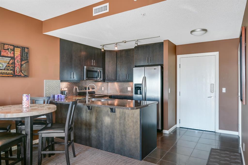 Located on the fifteenth floor of the iconic Vetro high-rise building, this sunny south-facing unit offers incomparable city views and an abundance of natural light. One of the larger 2 bedroom floorplans this two-bed, two-bath condo optimizes it’s usable space with its open concept layout. Kitchen features espresso stained cabinetry, granite counters and stainless steel appliances. The adjacent living and dining room areas are filled with sunlight thanks to the large bright feature windows and glass door. This door leads to a balcony with mesmerizing views of the city, river, and Saddledome and Stampede grounds. The perfect spot to watch the fireworks! The spacious master bedroom features a walkthrough closet to its own tiled 4-piece ensuite bathroom with soaker tub. Good sized second bedroom with its own full bathroom with cheater door. This downtown unit would make the ideal investment property, or be the perfect place to live for someone who wants to be close to it all. Price includes heated titled parking stall and lots of visitor parking. Tons of amenities in the building such as gym, theater room, pool areas, hot tub, roof top patios, and more. Prime locations steps to Victoria Park, C-train, River trails, Saddledome, Stampede Grounds, Sunterra Market, shops, and countless restaurants and entertainment venues! Here is your opportunity to own in Calgary’s upcoming and cultural district