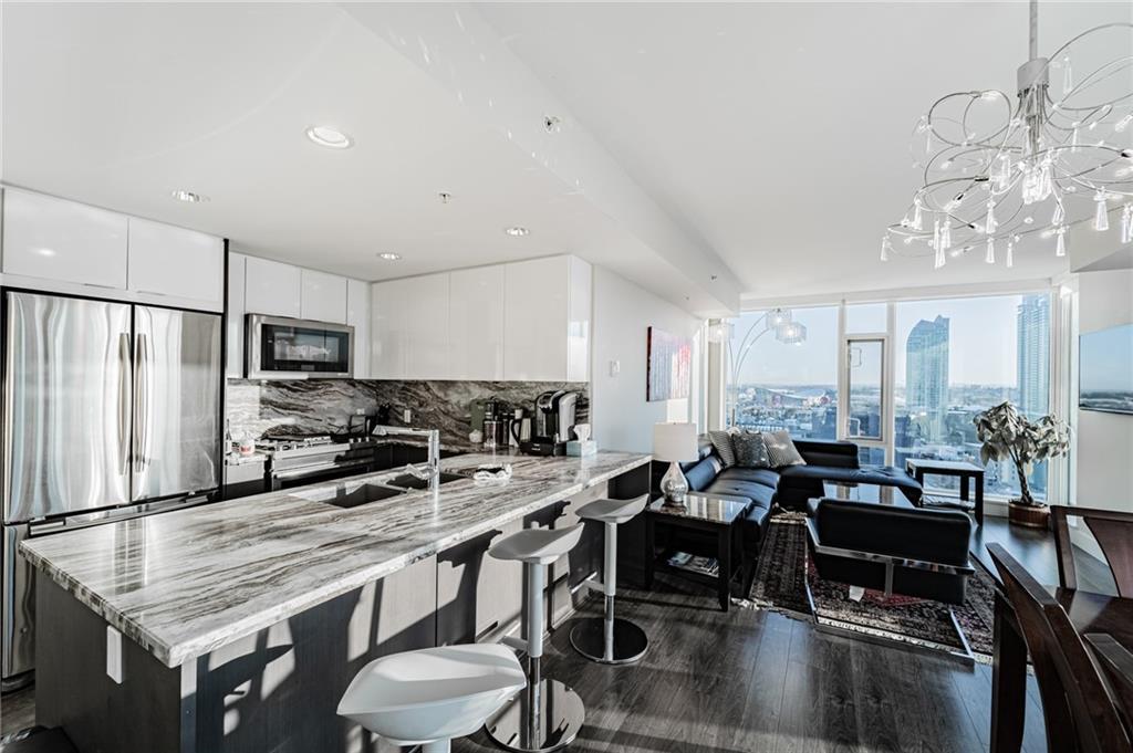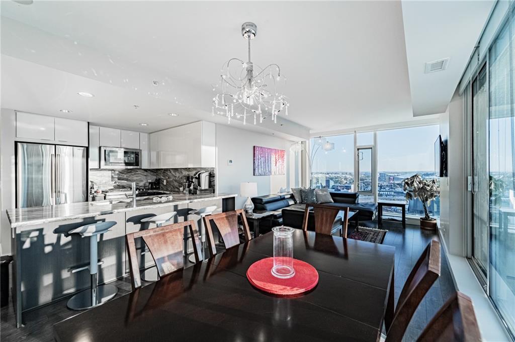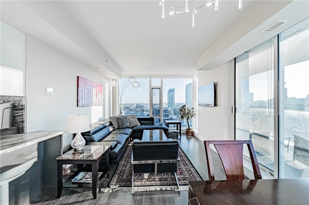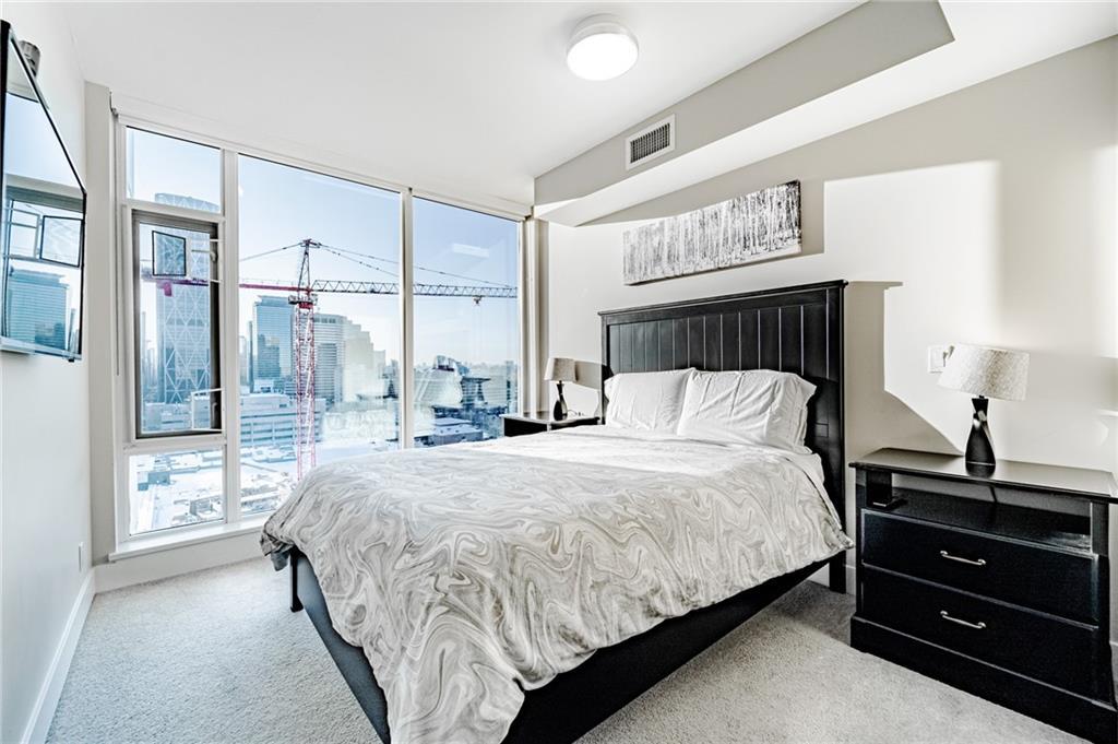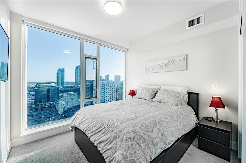 Views! Views!!! Views!!! This amazing corner unit is part of the highly sought after brand new Evolution by Embassy Bosa building in the newlyrevamped East Village which features a gym w/ sauna & steam room, party room, roof top patio w/ 2 BBQ stations, central A/C & 24 hrs Conciergeservice & located just steps to the LRT, the Bow River Pathways, shopping, restaurants, bike paths, bus stops & more. This unit features 2bedrooms, 2 baths, a gourmet kitchen w/ granite counter top, stainless steel appliances & breakfast bar and a large balcony with view of downtown and river. It also comes w/ in-suite laundry, outside- suite storage a private balcony/terrace w/ a BBQ gas line & heated undergroundparking stall.