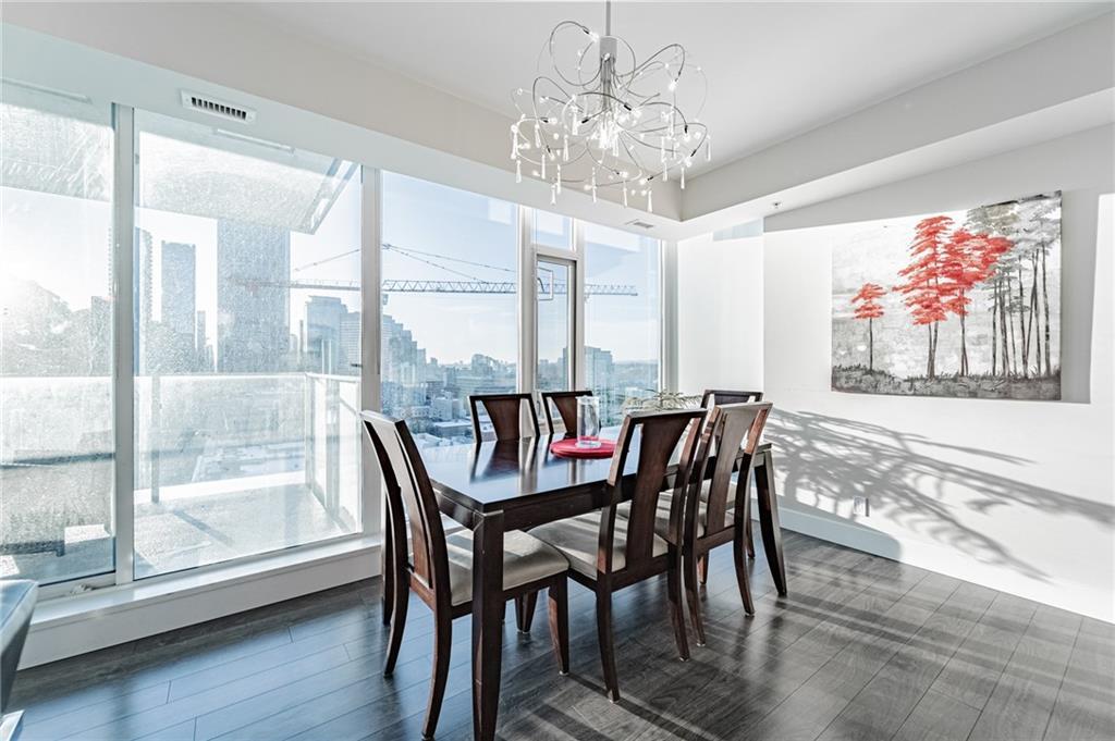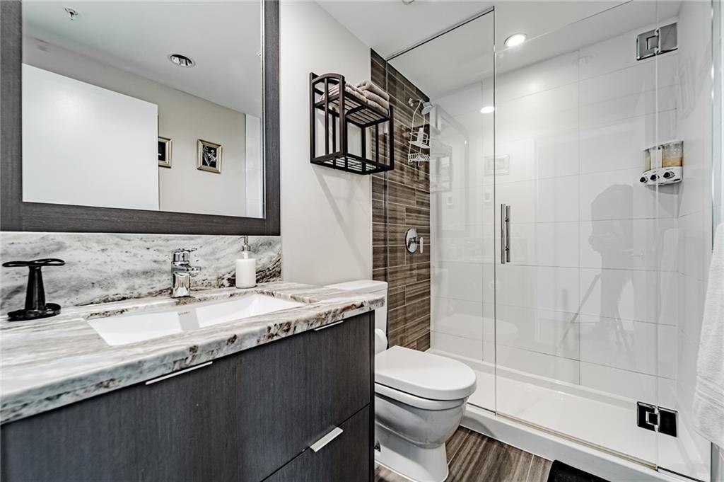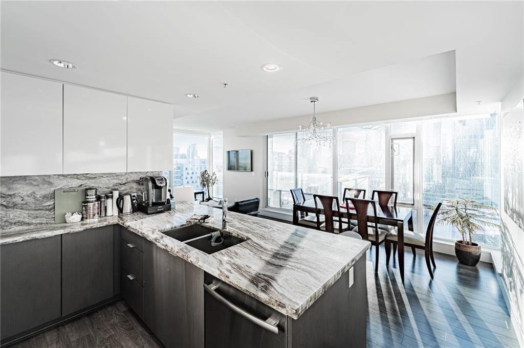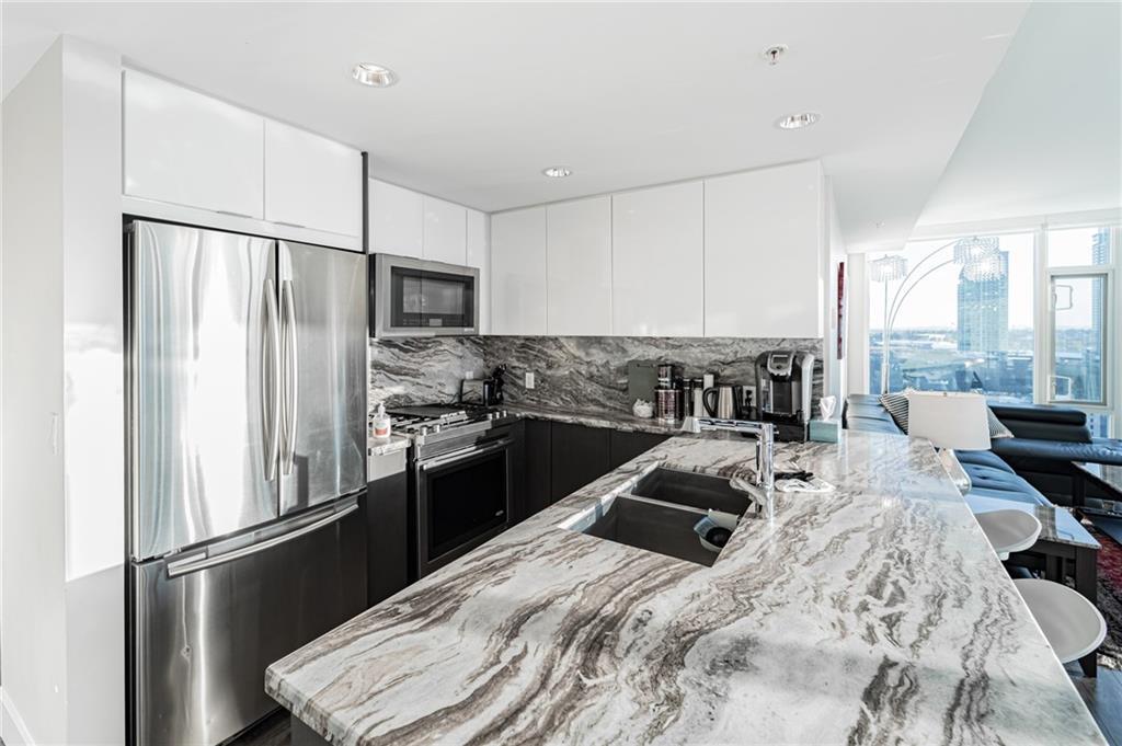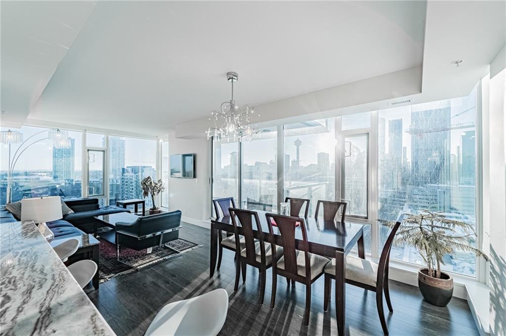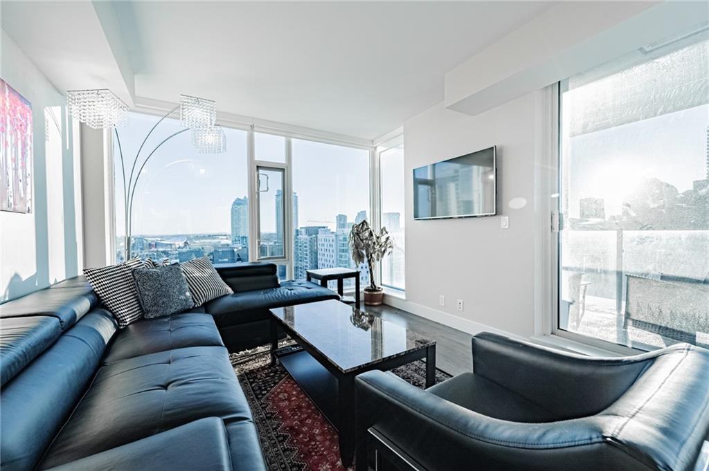 Views! Views!!! Views!!! This amazing corner unit is part of the highly sought after brand new Evolution by Embassy Bosa building in the newlyrevamped East Village which features a gym w/ sauna & steam room, party room, roof top patio w/ 2 BBQ stations, central A/C & 24 hrs Conciergeservice & located just steps to the LRT, the Bow River Pathways, shopping, restaurants, bike paths, bus stops & more. This unit features 2bedrooms, 2 baths, a gourmet kitchen w/ granite counter top, stainless steel appliances & breakfast bar and a large balcony with view of downtown and river. It also comes w/ in-suite laundry, outside- suite storage a private balcony/terrace w/ a BBQ gas line & heated undergroundparking stall.