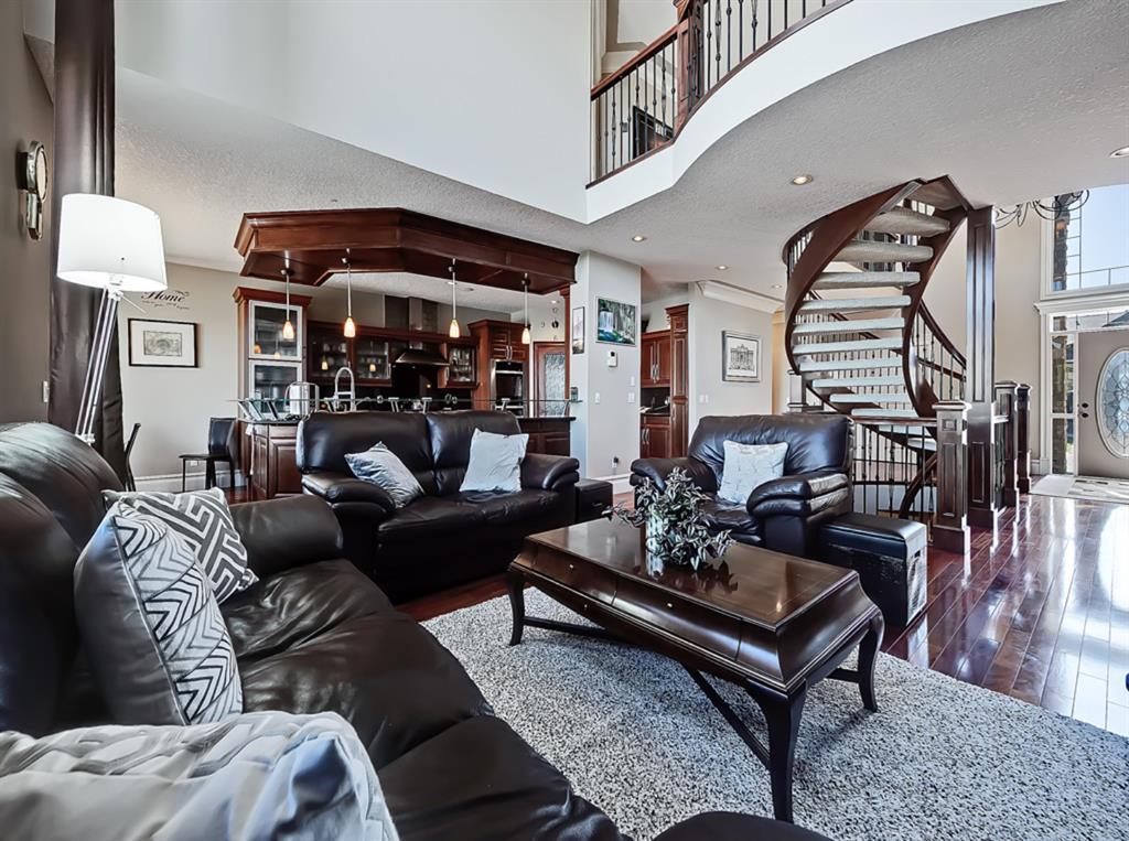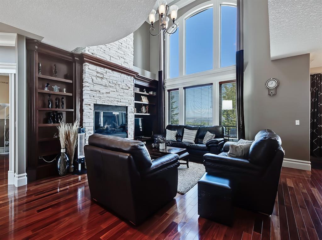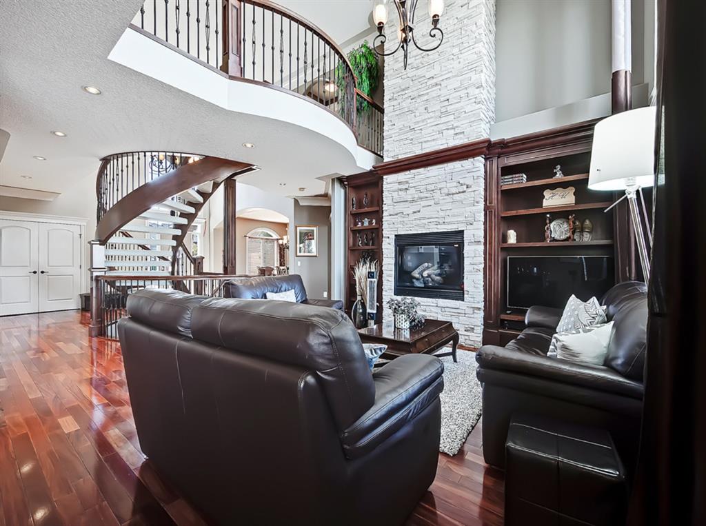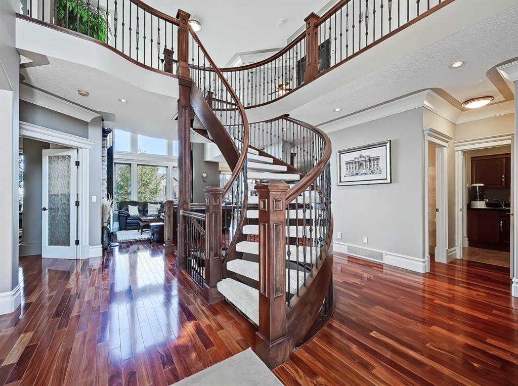 Welcome to Coulee Estates, the crown jewel of Cougar Ridge. This stunning home features 5 bedrooms, 4.5 bathrooms, gorgeous river valley views, basement movie theatre, upstairs bonus room and over 5065 SqFt of functional living space! This executive 2-storey home boasts high-end finishing from top to bottom. The picturesque 2-storey entry way has wonderful sight lines and a stunning spiral staircase, gleaming Brazilian cherry hardwood throughout the main floor, den with custom built-in cabinetry, formal dining room, stately great room that is open to the second level, and a sunny breakfast nook. The kitchen is a chef’s dream with extensive cabinetry and counter space, gas range, double-wall mounted ovens, granite countertops and walk-through pantry. The main floor is completed by a fully equipped laundry room (with laundry chute) and a powder room. The upper level hosts 3 spacious secondary bedrooms and split 2 full bathrooms. The luxurious primary bedroom has a private balcony to take full advantage of the river valley and city views. The upstairs is completed by a bonus room built over the garage. The fully finished walk-out basement is exquisitely finished with a theatre room, cozy family room, large fifth bedroom with ensuite bath, and a spacious, entertainment sized bar area. Enjoy the private patio area from the walk out entrance complete with a well maintained hot tub, and beautiful river valley and city views from the deck and master bedroom balcony. This well located enclave of Cougar ridge is quiet, close to endless paths and has quick access to all the amenities that 85th has to offer! This home is a must see!