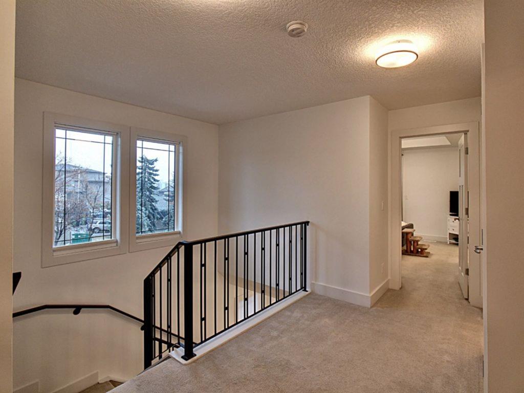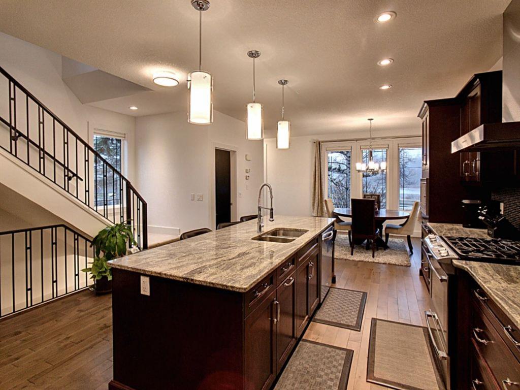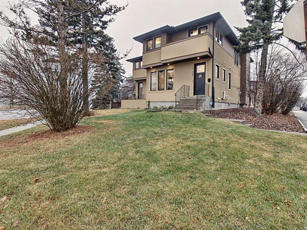 Beautiful Corner lot 2 storey home across from Bow River giving amazing views and nestled close to Shaganappi Golf Course, Downtown, pathways, trails, schools, parks and so much more! This home offers; granite counters, S.S appliances, 9ft ceilings, gas fireplace, gourmet kitchen, new hardwood floors(2019), new paint(2021), staircase lighting, under cabinet lighting, roughed-in central vac & sound system.Upstairs boasts an impressive 3 bedrooms with laundry for your convenience. Primary bedroom offers coffered ceilings, walk-in closet, 5pc shower/tub ensuite w/ double doors and a private balcony w/ gorgeous views. Main has a spacious living room, dining room & kitchen with 2pc bath, plenty of natural light, Basement is complete with generous size family room with Wet bar, 4th bedroom with big window for added sunlight + 4pc bath, utility room and storage room.