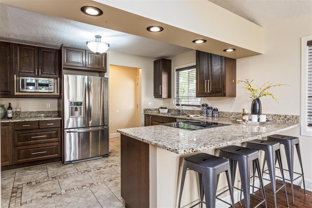 This gorgeous 1776 square feet bungalow is a rare find in the highly sought-after community of Brentwood. Completely renovated and remodelled in 2008 & 2010, this home offers over 2800 square feet of total living space. Walls were repainted before listing. From a grand entrance step into the large living spaces including a large central kitchen with stainless steel appliances, granite counters, a dining room and a living room with open beam vaulted ceiling, a wall of windows and 3-way fireplace. The master suite has vaulted ceilings, a walkthrough closet, a 5-piece bath and garden doors looking onto the rare yard. The bright and spacious home office/den is a perfect place for you to think and create. Two additional bedrooms and a full bath complete the main floor. Downstairs the fully developed basement comes with the 4th bedroom and a full bath, family room, flex area and laundry room. Other features are gleaming hardwood floors, modern