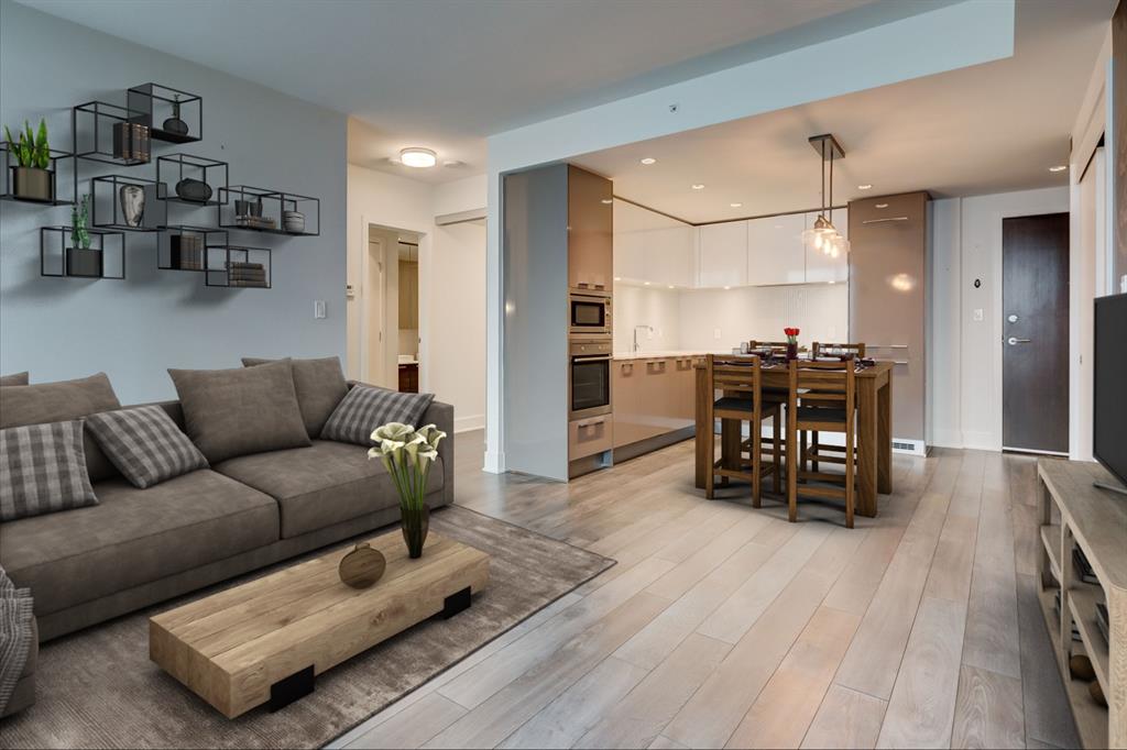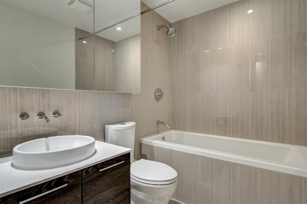 Hotel amenities at home! This building has amazing features for you to enjoy, including a rooftop BBQ/firepit/patio area, rooftop hot tub, large gym & fitness facilities, steam room & sauna, secure bike storage room, sun deck, party room, lounge, pool table, and more. To top it off, there’s a full time concierge and security for the building, to keep your home (and deliveries!) safe and secure. This unit boasts a FANTASTIC balcony, with enough room for a BBQ and table to enjoy the summer heat in comfort. Full length windows in the living and bedroom give you all-day natural sunlight, and the convenient open floor plan feels spacious and comfortable. A gas stovetop, built in oven AND microwave, plus built-in dishwasher and fridge equip the kitchen with everything you need to enjoy cooking at home. With a ton of counter space and storage, the kitchen is built to be used! In-suite laundry and central A/C, large secure storage locker, titled parking, and in-floor heating all tick the boxes for what you’re looking for in your next home. As a 1bed + den, this floorplan offers great flexibility – use the den as an office, reading nook, or even a walk-in closet/storage in addition to the full closet in the master bedroom. Complete with modern finishings and fixtures, this condo is waiting for you to move in and enjoy.