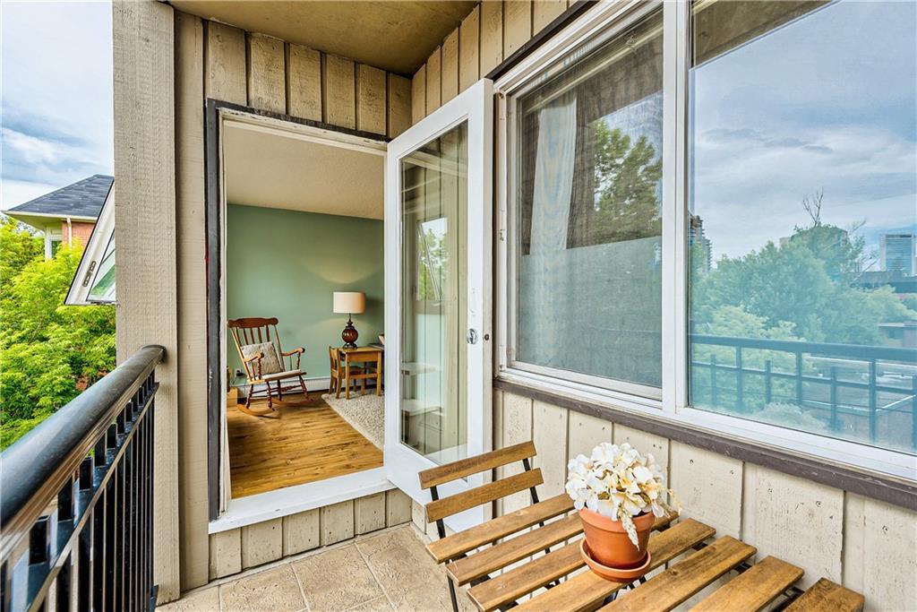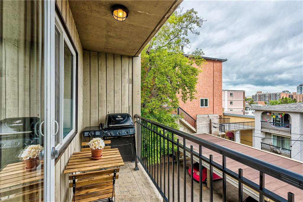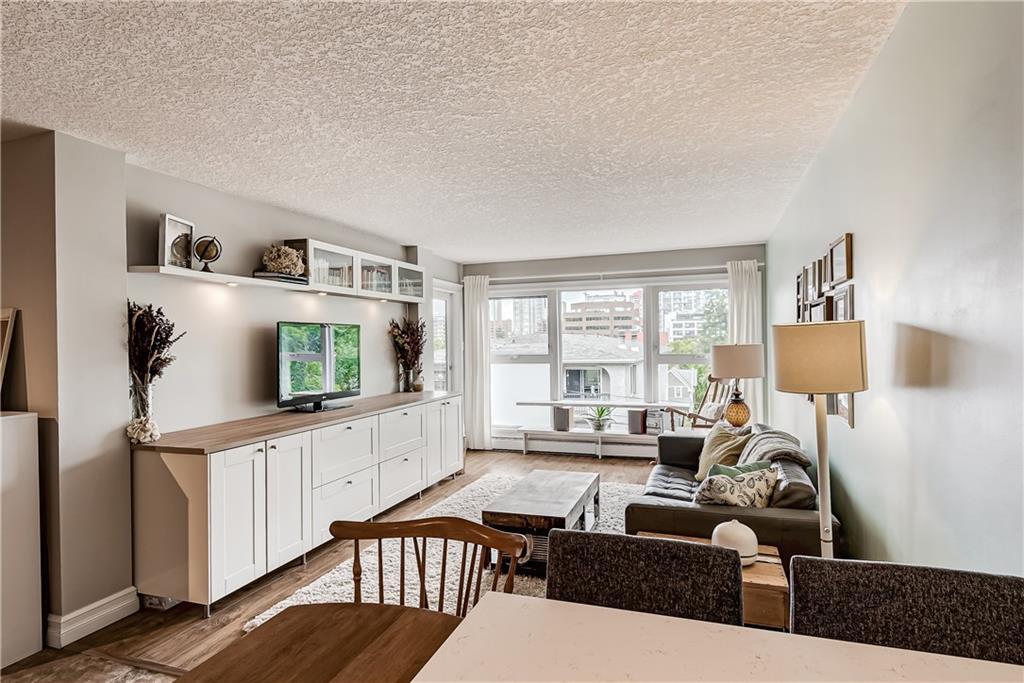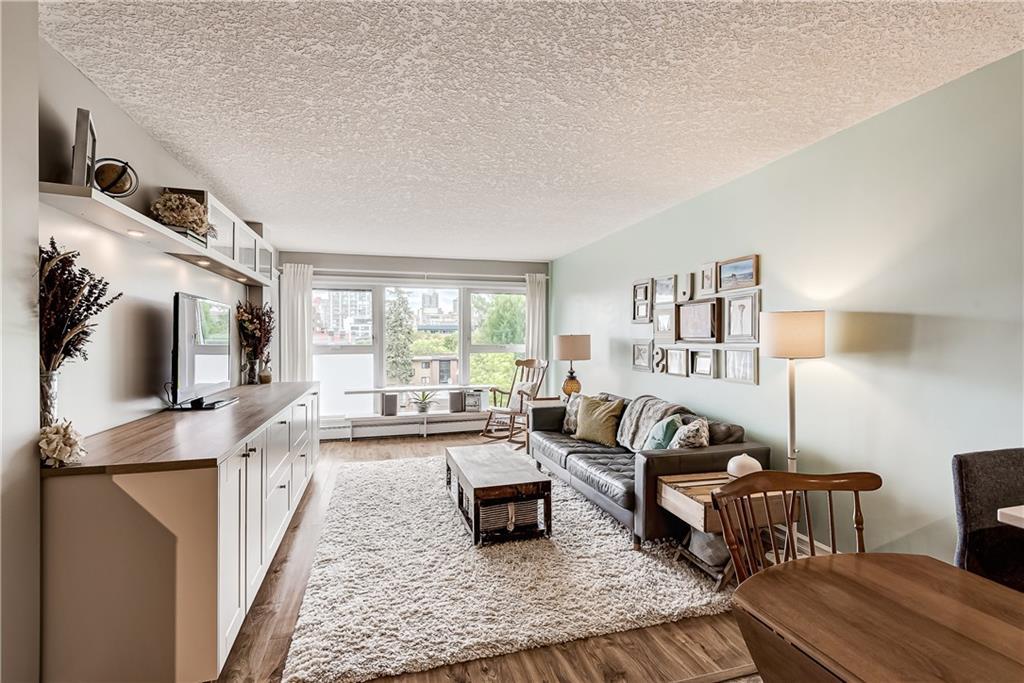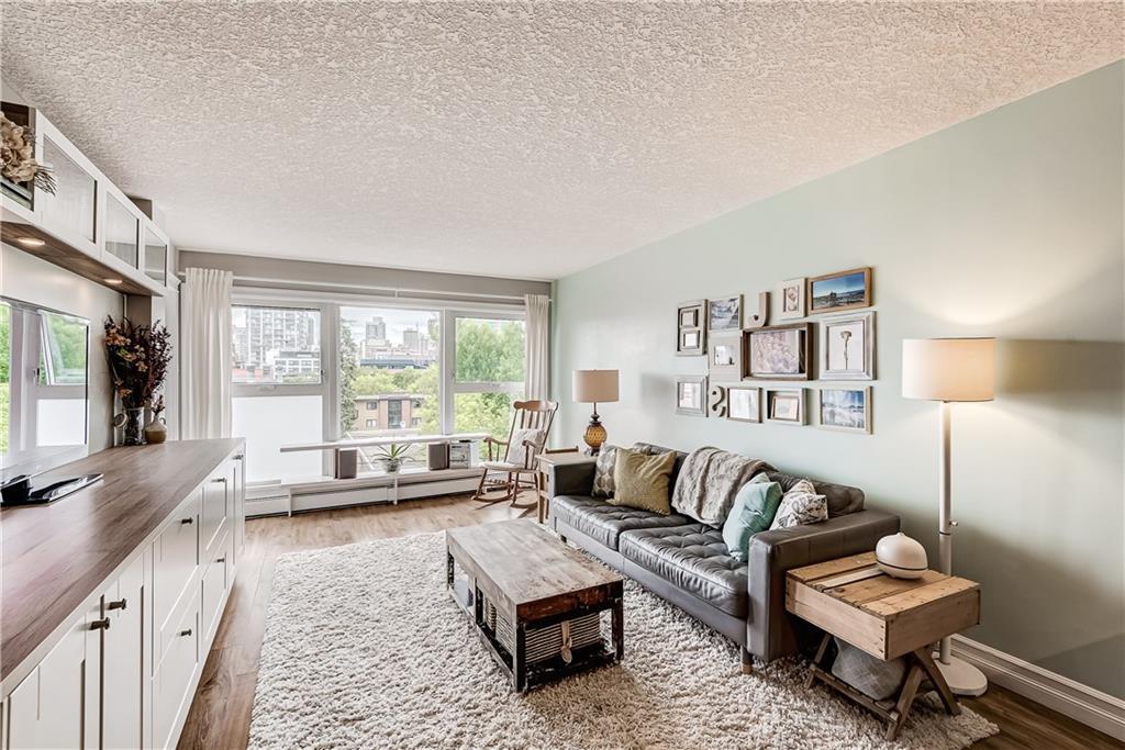 Welcome to Lower Mount Royal, nestled amongst the mature trees on one of the most historical streets in the neighbourhood. This 2 Bedroom, 1 Bathroom Condo with over 842 sq ft of living space is not only situated in a great location but also comes with an amazing view of Downtown Calgary. CHECK OUT the 3D MATTERPORT and see for yourself! The bright and open unit boasts newer gleaming laminate hardwood floors in the living room and bedrooms, new stone countertops in both the kitchen and bathroom. The unit comes with large master bedroom and good sized second bedroom. This boutique building features only 18 units, secure covered parking, well-managed board, healthy reserve fund and great neighbours. It is a mere 2 minute walk to the famous 17th Ave with its many trendy restaurants, GoodLife Fitness, boutique shops, medical, dental and public transit. Why drive when downtown, the C-train and the Saddledome are at your fingertips. A short walk to anywhere downtown or take an inexpensive Uber ride.