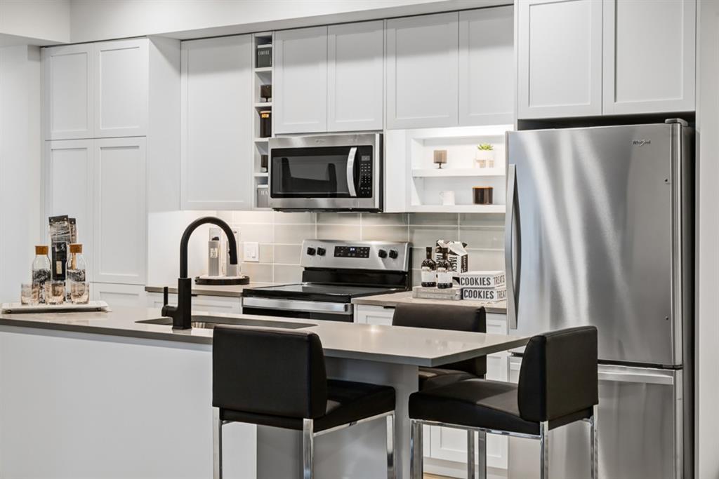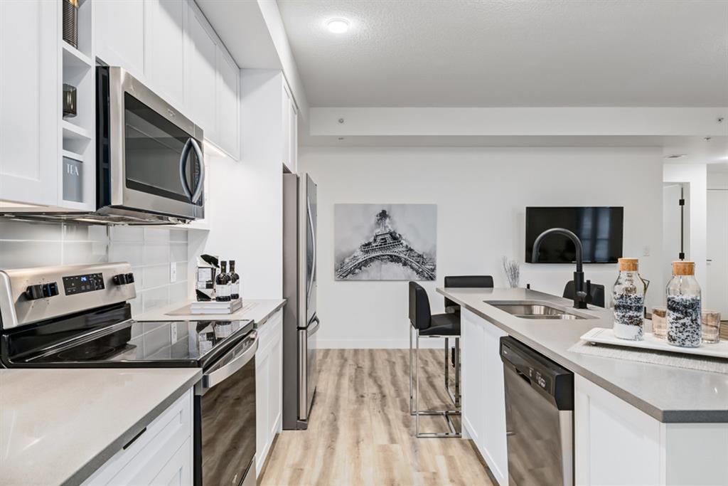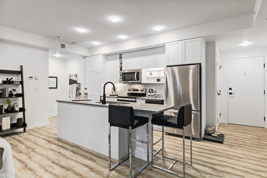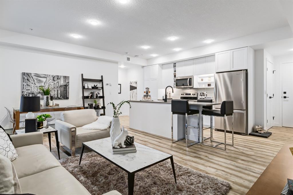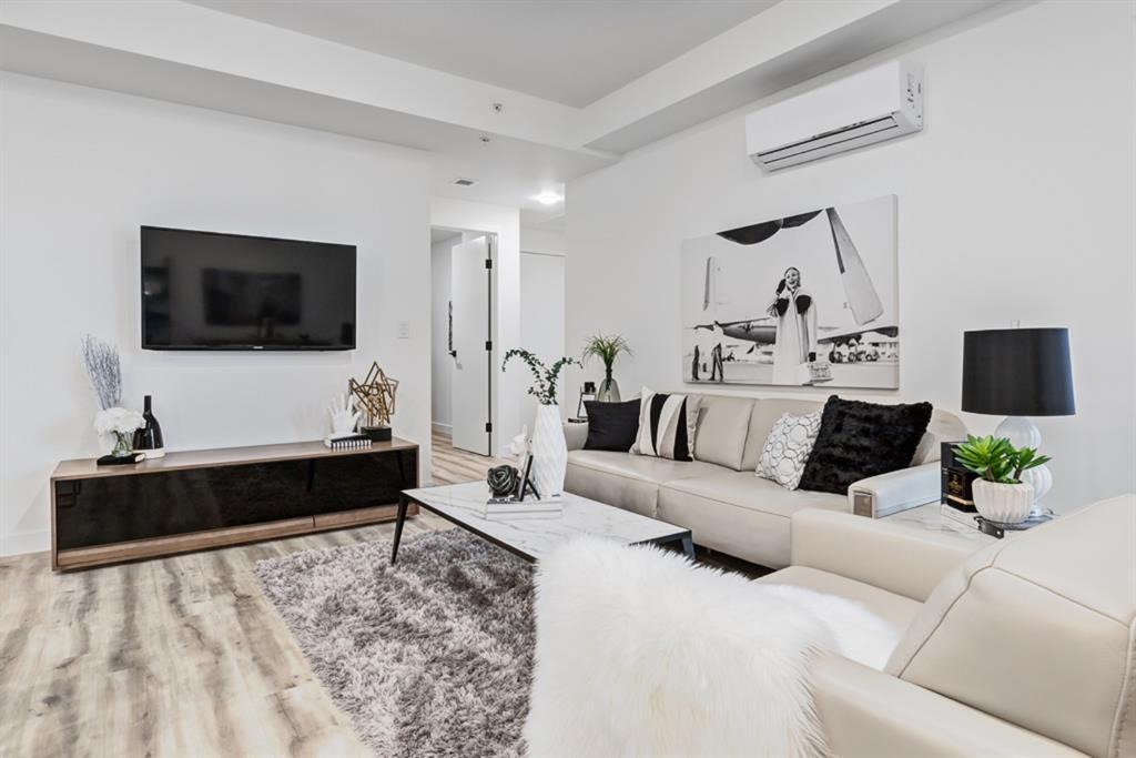 The “AUGUST” is located in the HEART of the highly sought after new community of UNIVERSITY DISTRICT. Stunning SOUTH facing 2 bed + den Condo is located on the third floor. Overlooking University Avenue. Many FEATURES include oversize Low E TRIPLE PANE windows, 9 FT. CEILINGS, upgraded LUXURY VINYL PLANK flooring, FULL HEIGHT CABINETS in the KITCHEN, Full height tile back splash, STAINLESS STEEL appliances, QUARTZ counter top throughout, space for a FULL SIZE stacked washer and dryer, Gasline to BBQ, Air Conditioning and more. The “AUGUST” boasts a 700 square foot lounge with kitchen for residents located off the main secured front lobby, car wash bay in parkade, ample bicycle storage as well as a 4,200 square foot ROOFTOP PATIO with GAS FIREPLACE, bench seating and large planters to enjoy. The University District is surrounded by amenities right outside your door with more to come and is within walking distance to the Children’s Hospital, U of C and Market Mall and only a short commute or bike ride downtown.