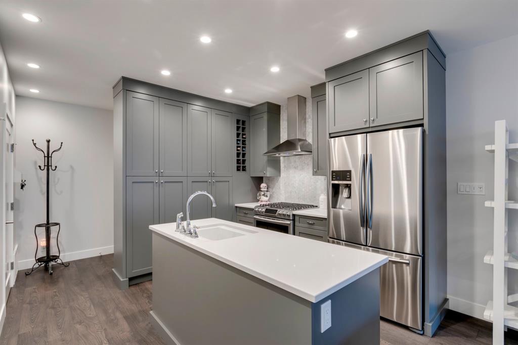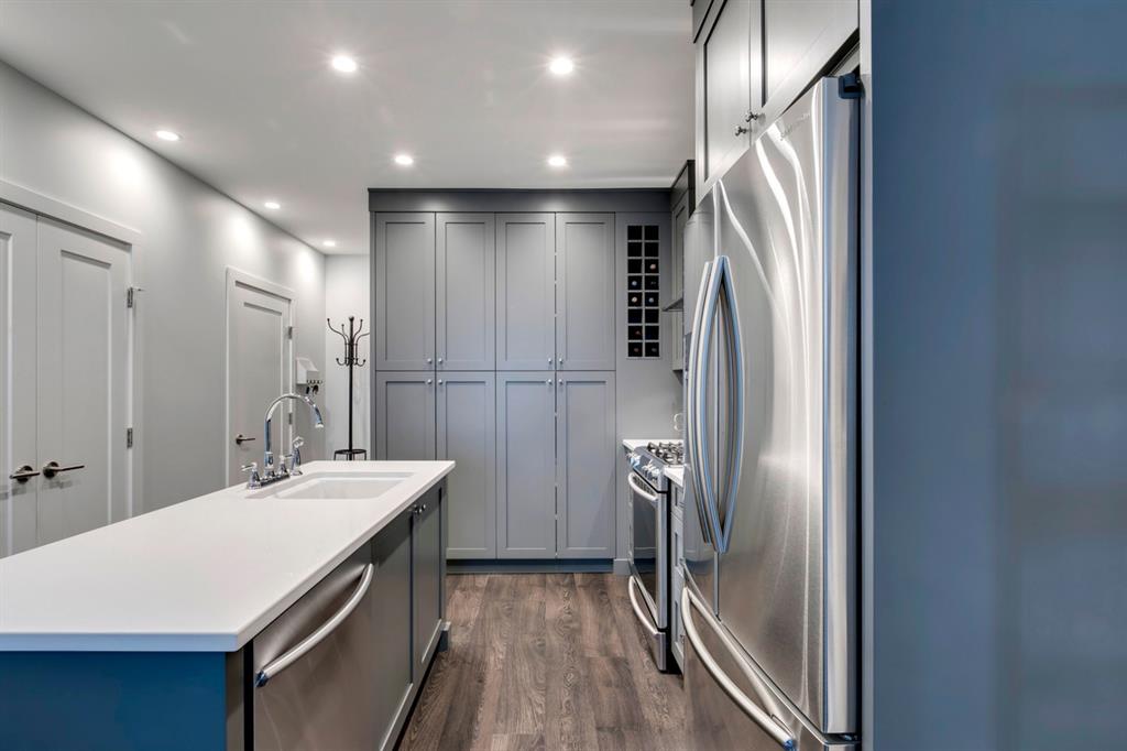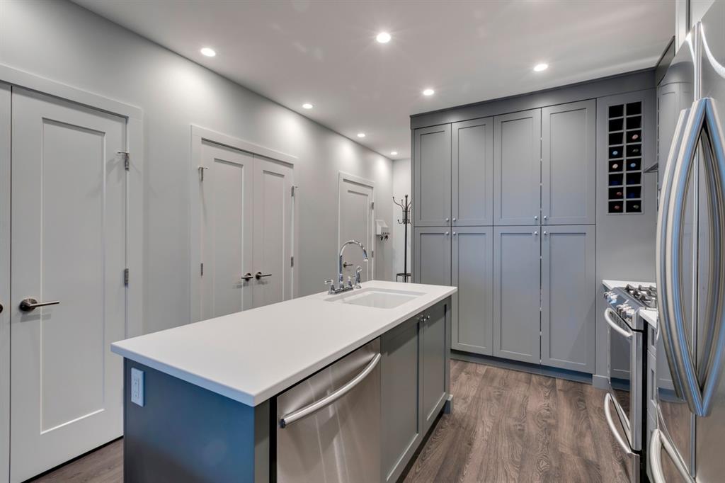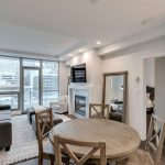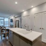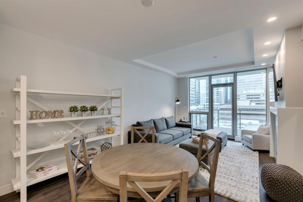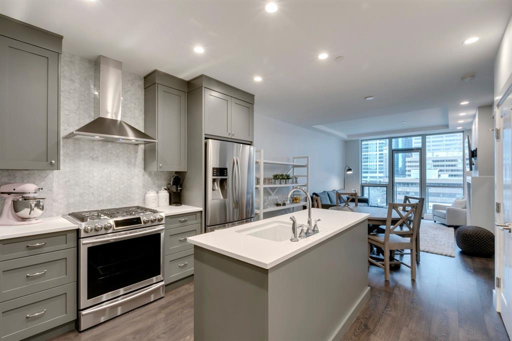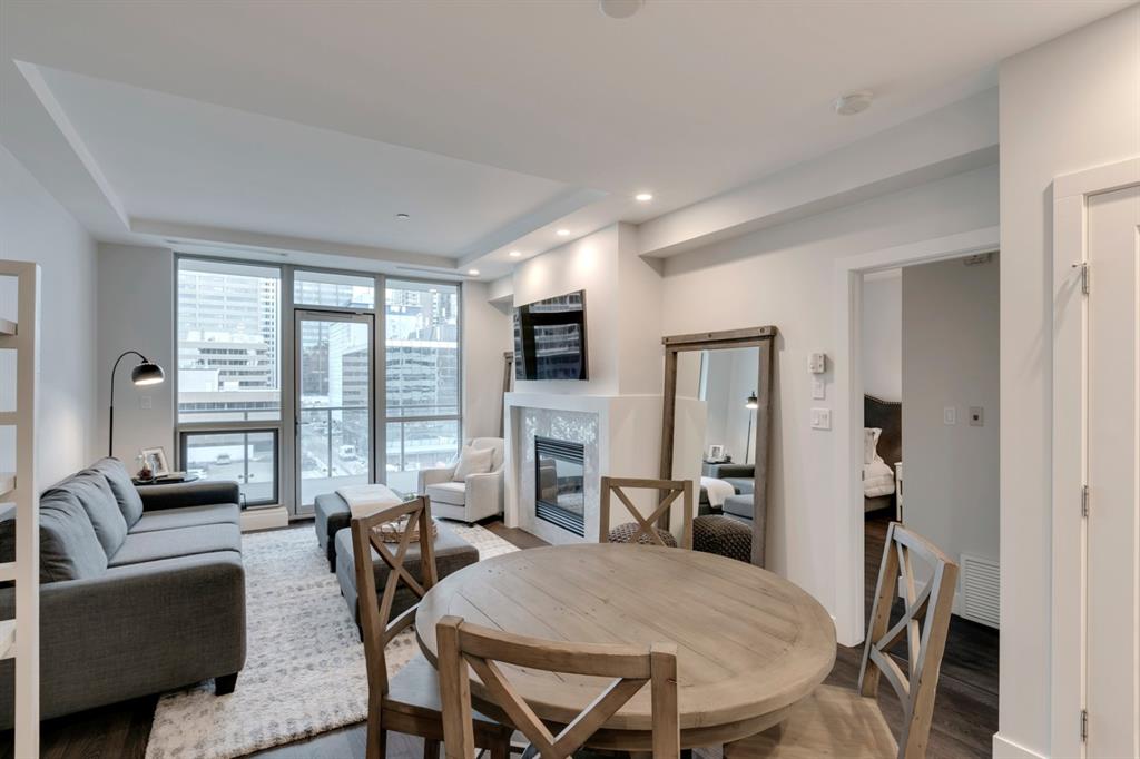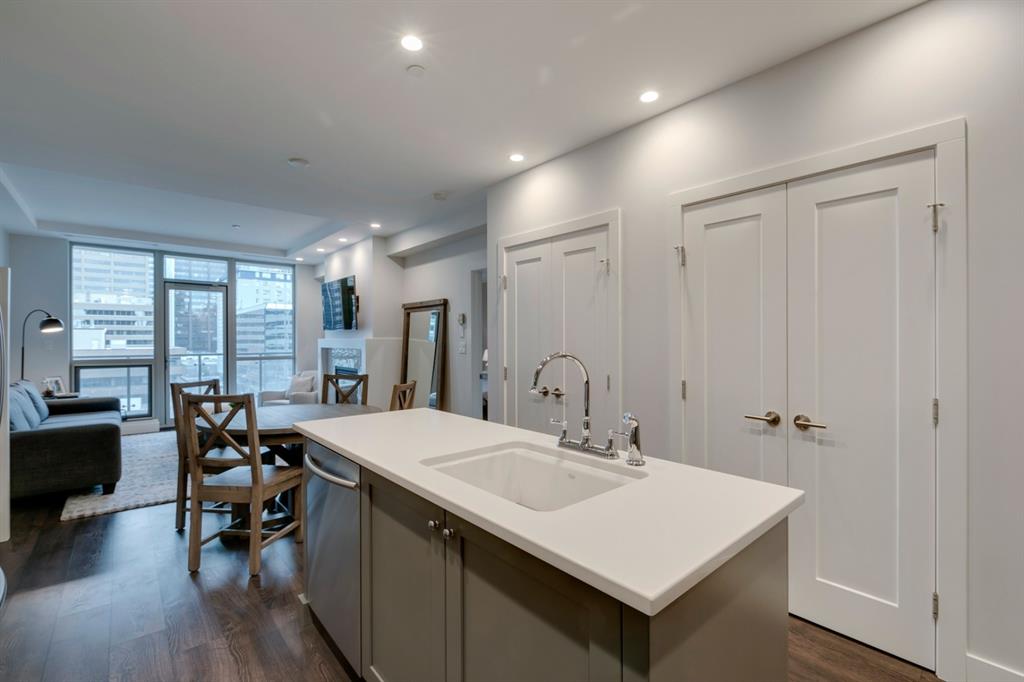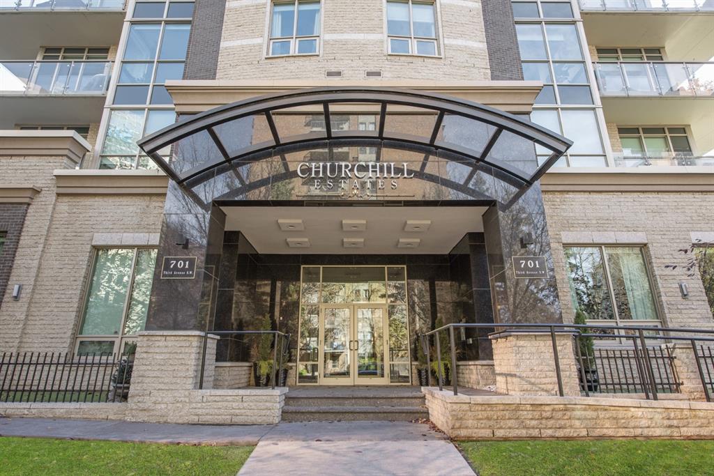 Over $100K spent in professional renovations by Renova! Tasteful, stylish & spacious one bedroom unit located in prominent Churchill Estates in Eau Claire! This unit presents hardwood floors & an open floor plan showcasing a living room with double sided fireplace, coffered ceiling & floor to ceiling windows open to the casual dining area & kitchen finished with quartz counter tops, island, plenty of storage space & a stainless steel appliance package. The generous sized bedroom boasts a fireplace, walk-in closet & spa-inspired 5 piece bath, dual sinks, relaxing soaker tub & glass enclosed steam shower. Further features include a 2 piece powder room, in-suite laundry, built-in speakers, one titled underground parking stall, titled storage space & grand 30’6×10’ wrap around patio with south & east downtown skyline views – perfect for summer outdoor entertaining under the twinkle of city lights. Building amenities include weekday concierge service, car wash, bike storage & gorgeous lobby. This luxurious unit is located just a short walk to Bow River pathways, Prince’s Island Park, downtown shopping & entertainment & close to vibrant Kensington shops & services.