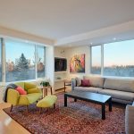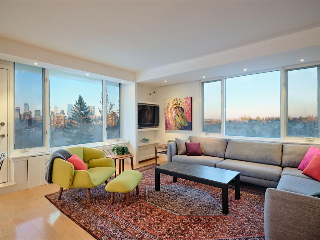 OPEN HOUSE SATURDAY 1:00 to 3:00 on DECEMBER 4th. This double wrap around end unit features breath taking views, from the oversize windows, on all three sides. This amazing 1412 sq. ft. floor plan has been professionally designed and renovated. Two spacious bedrooms, two ensuite bathrooms, inviting den, large in-suite laundry room and two balconies, 2 side x side indoor heated parking stalls and two storage lockers! Upgrades include new full height interior doors throughout, modern lighting, automated blinds in the living room and kitchen, all new radiators plus a custom designed radiator in the master ensuite. Living room is perfect for entertaining with the dry bar and dramatic views from two oversized windows and door to the 4’3″x37’10” long balcony! Expansive dining area offers lots of room for your guests to dine while enjoying the downtown skyline. Perfectly designed kitchen with an Italian flair featuring custom cabinetry, Caesarstone counters with eating bar, high end stainless steel appliances, including a Sub-Zero fridge, Miele dishwasher, Kohler faucet and high-end light fixtures. Welcoming Den area makes a great retreat or media area. A wonderful inviting master bedroom with full wall windows and door to the sunny south 4’3″x27’5″ long balcony. Indulge yourself in the spa inspired luxurious four piece bathroom and unwind. Inviting deep soaker freestanding tub is the centerpiece of this spacious room that offers incredible downtown city views. Two walls feature elegant white full height custom cabinets with built-in wardrobes and pullout drawers. Ceaserstone vanity and custom cabinetry. Private toilet alcove and oversize tiled shower. Second large bedroom or home office where the natural light flows in and the views are amazing. This room makes a perfect office featuring a full wall of custom built computer area, storage cabinets and upper shelving. This room also features generous custom closet area and three piece ensuite bathroom featuring, Ceasarstone vanity and over size walk-in shower. Convenient in-suite fully equipped laundry room features stacking LG washer and condensing dryer, sink and custom cabinets. Located on 13 acres of private manicured grounds, including seasonal pool, waking distance to the Elbow River pathways, 4th Street shops, many restaurants and services and minutes to the downtown core! Please check out the professional video and photos.