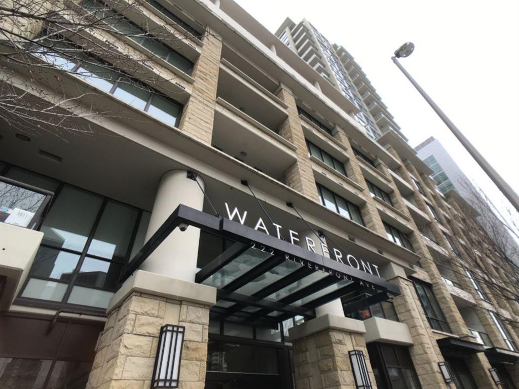 Beautiful and large 1 bedroom & Den unit with gas fireplace, hardwood flooring, 9ft ceilings, floor-to-ceiling windows, high end finishings and a short walk to downtown and Eau Claire in just minutes from this amazing location on Riverfront Ave! Heated underground parking and the condo has views of the river and center street bridge from the living room and balcony. The building offers a prime location and a number of building amenities including 24 security personnel, concierge desk, lounge, exercise facility, sauna, and hot tub. If you work downtown, downsizing or looking for an investment property close to the river and walkways this property is for you.