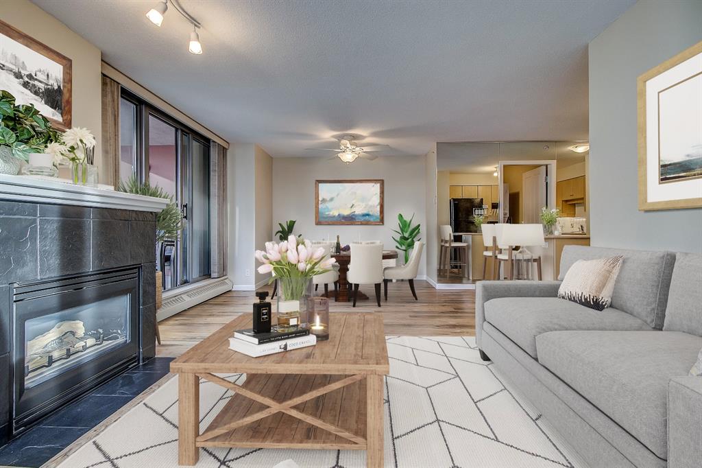 Welcome to the AXXIS and suite 701! Located in the community of Downtown West, this bright and spacious 2 bedroom, 2 bathroom, 945 sq ft bright and spacious unit will welcome you home. It’s south and west facing corner unit exposure and floor to ceiling windows, lets natural light flood in and shows off Calgary’s downtown city life. This immaculately kept suite has been tastefully updated with brand new vinyl plank flooring and fresh paint. The open plan of kitchen, dining and living rooms is the perfect layout for functionality as well as entertaining. The spacious kitchen with it’s light maple cabinetry, ample counter space and additional centre island provides lots of storage space and is open and inviting. The expansive living and dining rooms are surrounded by walls of those full height windows, and feature a modern black fireplace and access to the large, private, west-facing balcony. The master bedroom is spacious enough for a king-sized bed and features two mirrored closets and a 4 piece en-suite. You’ll love the deep soaker tub, tile to the ceiling, full mirror, under cabinet with drawer and extended countertop for even more space. The second full bathroom is similarly set up but has a very large walk-in shower with sliding glass panel doors. This unit comes complete with a spacious in-suite storage room, in-suite laundry and a heated underground parking stall. The Axxis, built by Bosa Development is a well-built complex with concrete construction and boasting sound insulation and fire safety between units. It is a well managed condominium building with on-site management and amenities including a well-appointed exercise room, a beautiful social room with kitchen, outdoor terrace, visitor parking and bike storage. In a terrific location, this suite is just steps to the free-fare downtown LRT, Bow River pathways, Kensington, Eau Claire, coffee shops and restaurants. This is a pet-friendly building.