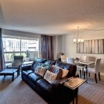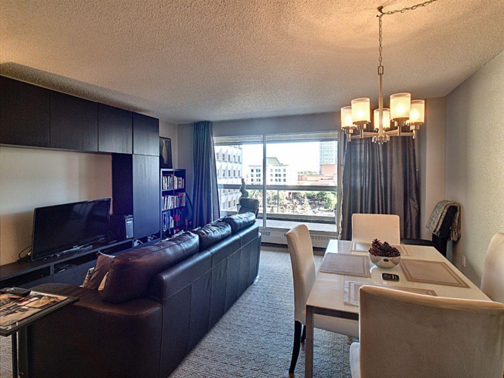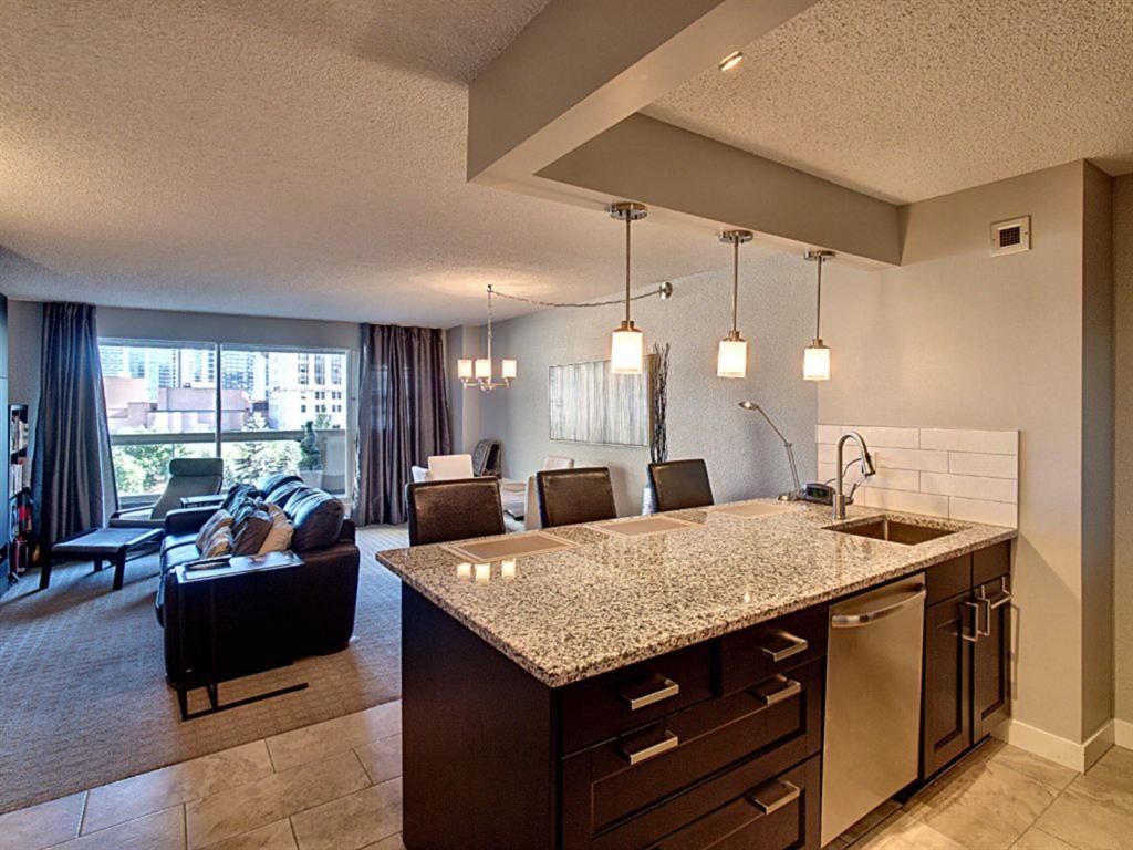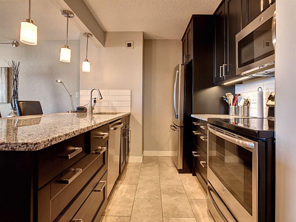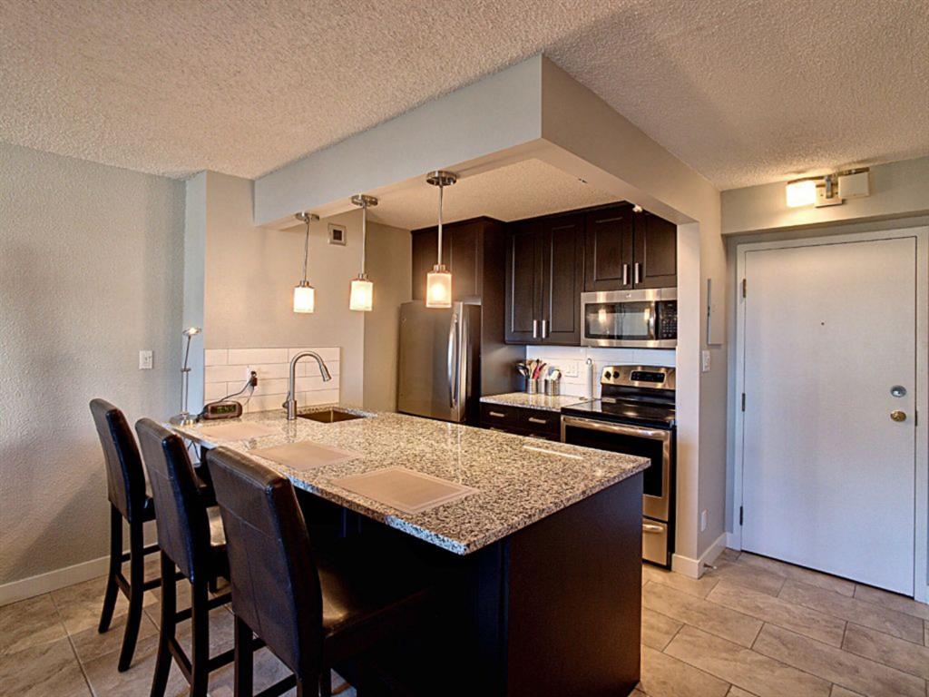 Royal Mountain Court where location is amazing! Only blocks from Stephen Ave, Riverfront, C-train, superstore, shops, restaurants & more! Features Modern lighting w/ Dimmer lights, Full height & pull out cabinetry, S.S appliances, under cabinet LED lights, Brushed nickel faucets, Travertine Porcelain tile, Granite counters w/ huge centre island breakfast bar & cabinets underneath. Living room has massive built-in wall unit & access to huge south facing balcony w/ inside controlled lighting & views of Olympic Plaza, Calgary Tower & downtown. Beautiful bathroom w/ shaker style cabinets, vertical built-in shelving & low flow toilet. Bedroom has modern his & her closets w/ additional storage, auto LED lights & blackout blinds. Barn door for Den w/ day bed, built-in white cabinets & storage closet. Enjoy amenities like racquetball/basketball court, sauna, exercise room & common area patio.