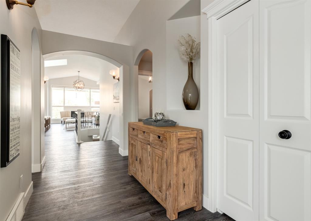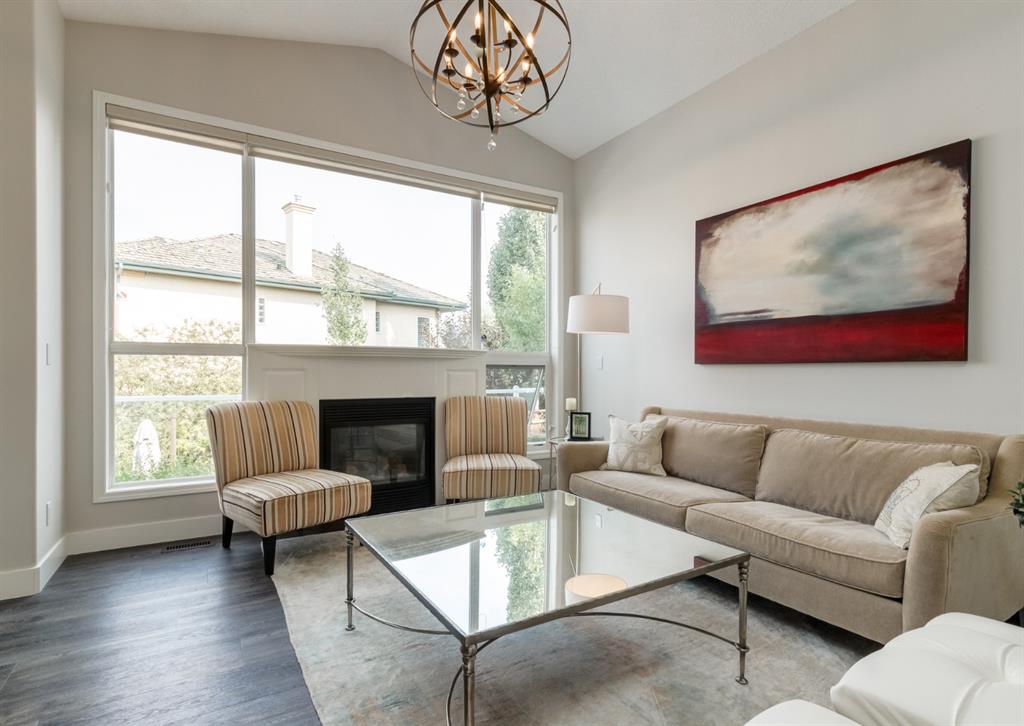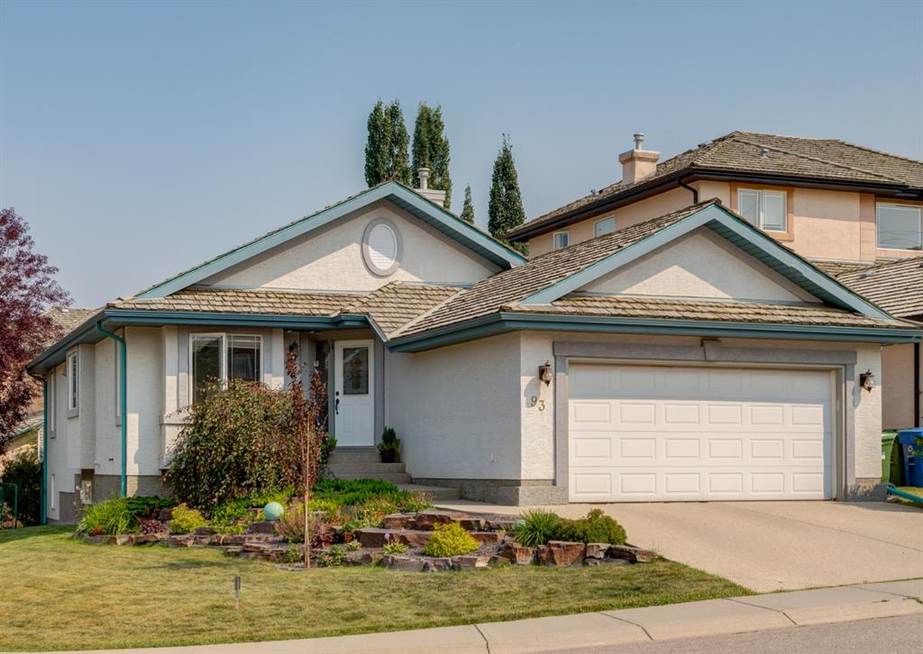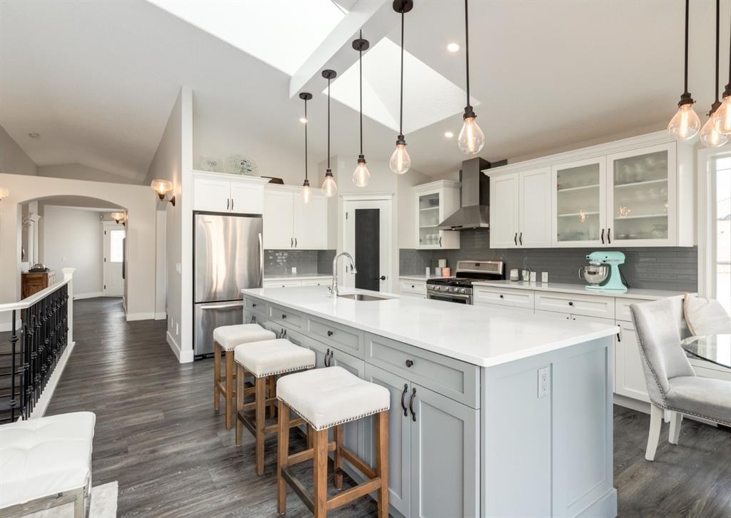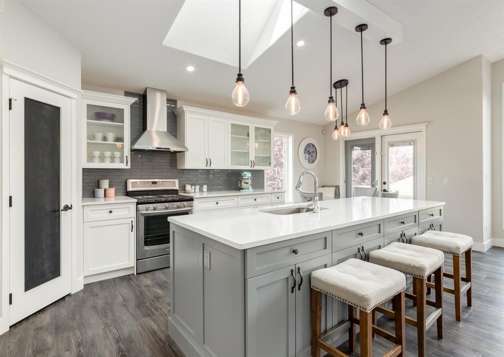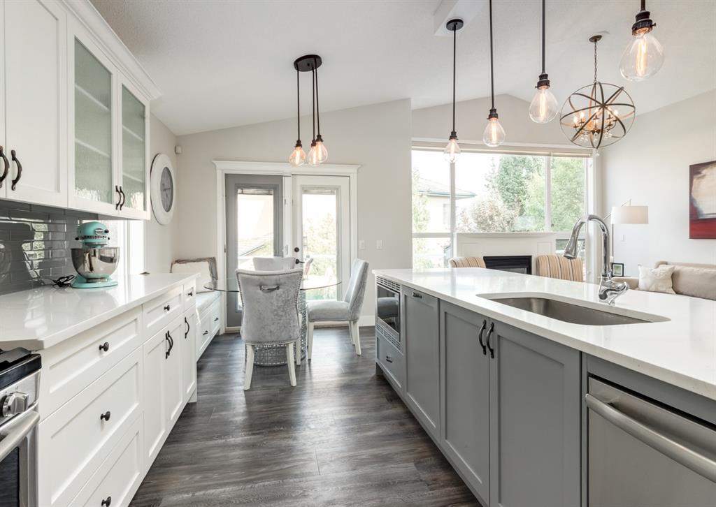 Welcome to the Estates of Valley Ridge! Perfectly positioned on a quiet corner lot with beautiful curb appeal and professional landscaping. This 3-bed executive bungalow is a rare find, having undergone extensive renovations with no expense spared in 2018/19 (200K). Upon entry, be welcomed by the bright open concept floorplan. The white kitchen is on-trend and has an abundance of cabinetry complimented with stone countertops, vaulted ceilings, and a feature skylight. The inner chef in you will love the newer appliances and gas stove. A large contrasting island is perfect for entertaining the largest of dinner parties while providing a more intimate setting alongside the adorable breakfast nook with banquette seating with a view of the spacious living room anchored and warmed by a panelled gas fireplace framing your views. The rear of the home has large windows with a patio door leading you out onto the updated deck overlooking the fully landscaped yard below.